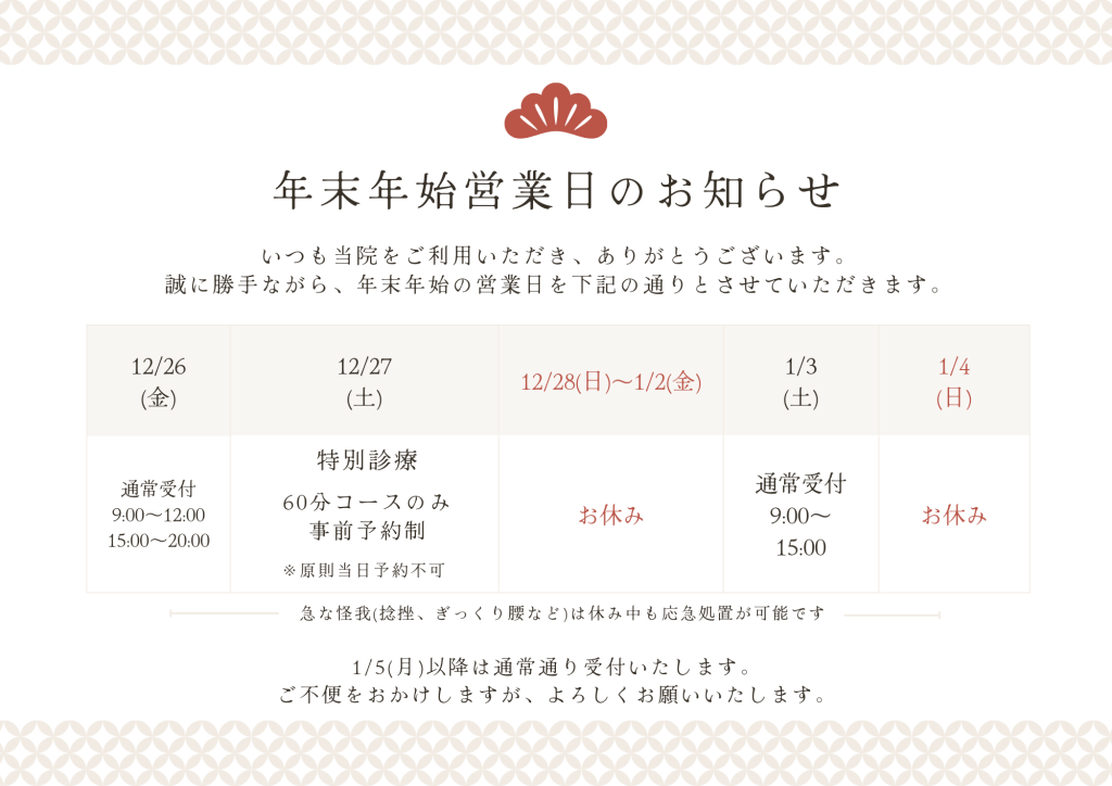 年末は12/26(金)が通常受付の最終日となります。